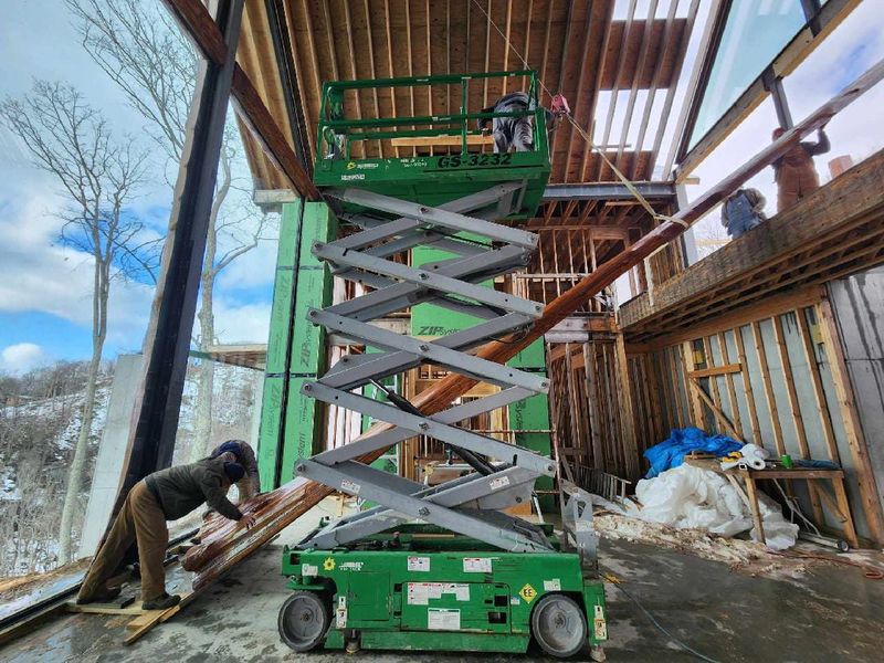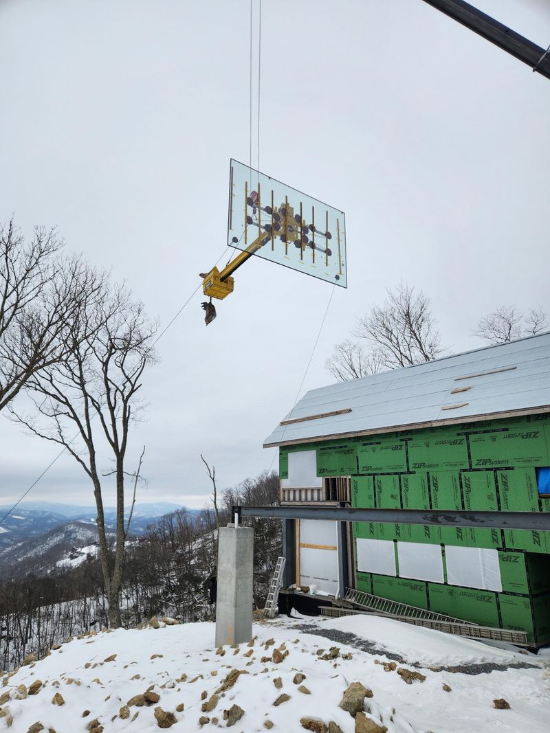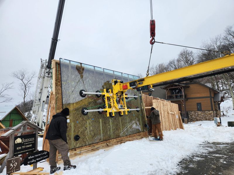 On the night before the glass was being delivered from Canada, a snowstorm struck the area. The resort security team would not allow any trucks up the steep roads until after they had been cleared and sanded. In the afternoon, even though it continued to snow and the roads were still snow covered, we were able to use several other vehicles and tow straps to form a wagon train and pull the trucks up the mountain and near the site for unloading. We had to transload the oversized glass panel crates to the site from there in the snow the next day by chaining up a smaller truck/trailer combo.